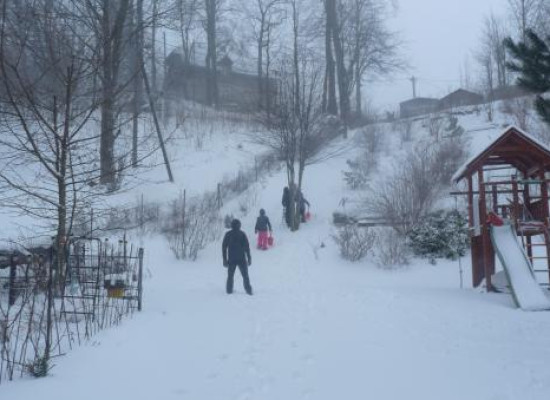 W naszym ogrodzie przygotowaliśmy górkę do zjazdów na listkach lub jabłuszkach oraz teren do zabaw na śniegu. W pobliżu naszego domu można pobiegać na nartach biegowych. Nie daleko jest też do Szklarskiej Poręby czy Karpacza gdzie czekają przygotowane stoki dla narciarzy.